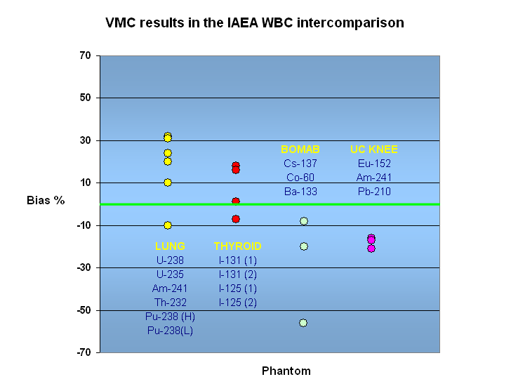 The IAEA promoted an international intercomparison with the title “Measurement of the quantity ‘activity’ of radionuclides in simulated human organs”. The intercomparison exercise began in 2001 and ended in 2005. The results of the intercomparison are available here. 12 MC is the VMC in-vivo intercomparison number.